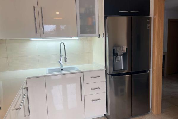 Una cuina moderna molt ben equipada amb nevera americana amb accés a un porxo i terrassa amb vistes al jardí i a la piscina.
