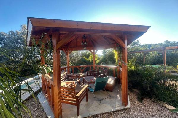 The outdoor area is carefully designed for comfort and leisure. It has a summer kitchen with a games room, a traditional bread oven and a griddle. The beautiful pool has an electric security shutter and is accompanied by a hut with sink, shower and toilet. Next to the pool is a charming wooden gazebo, perfect for relaxing in incomparable surroundings.
