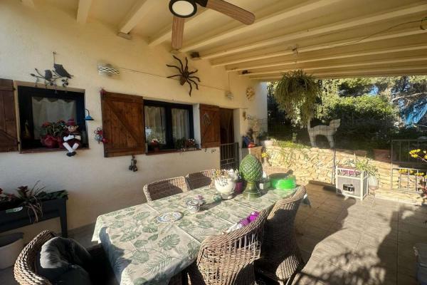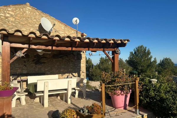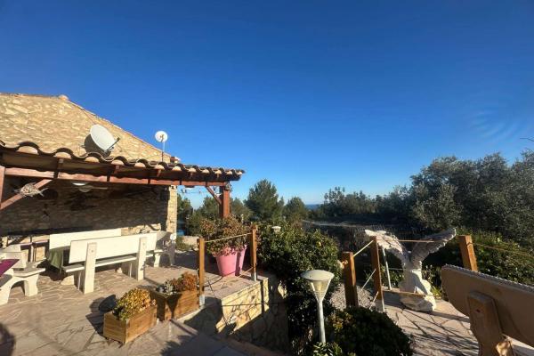 The main house is complemented by several terraces that offer different environments. A large covered terrace next to the house, ideal for enjoying meals al fresco; an open upper terrace equipped with garden furniture and panoramic sea views; and a third covered terrace with the same stunning views.