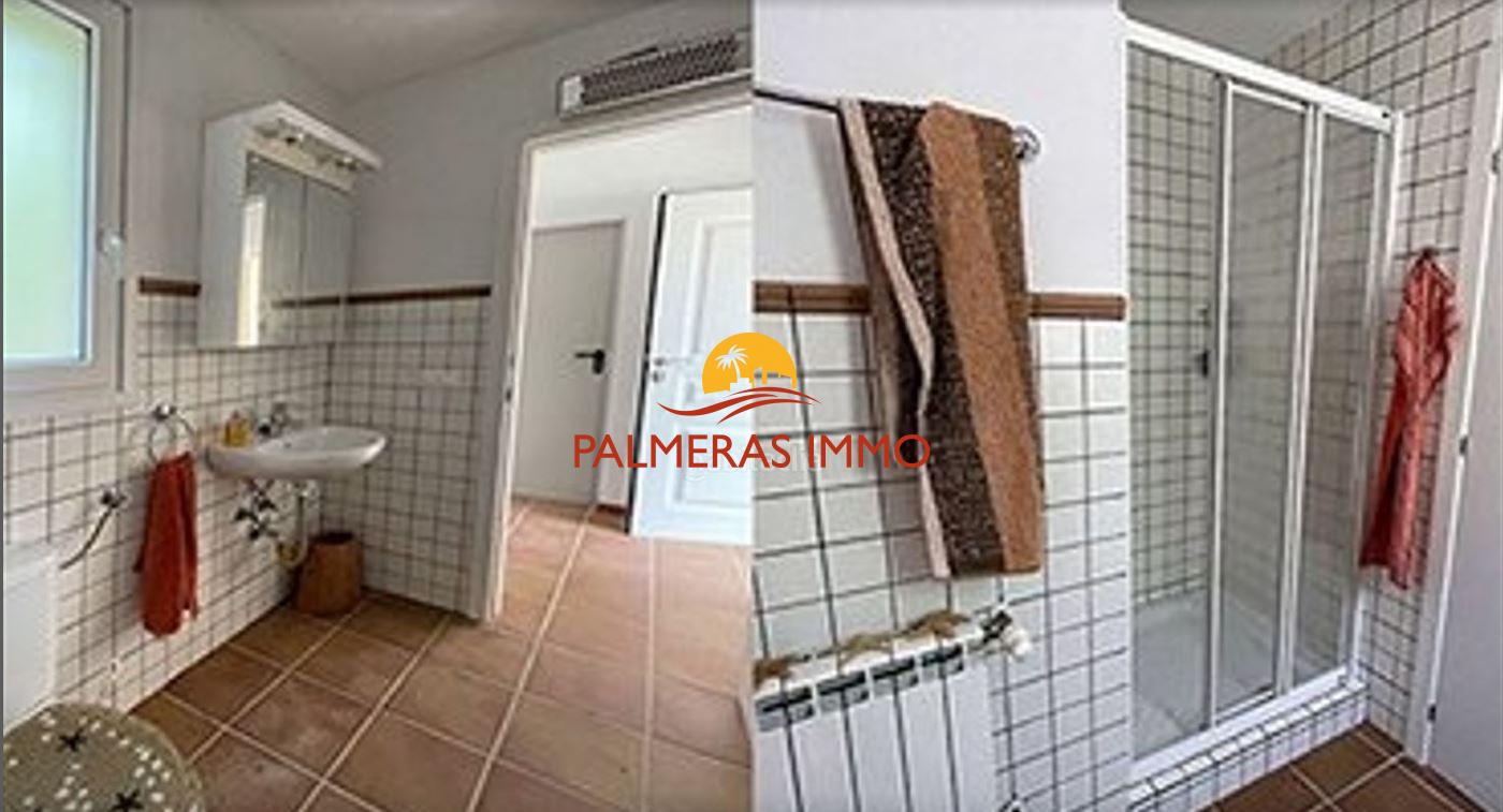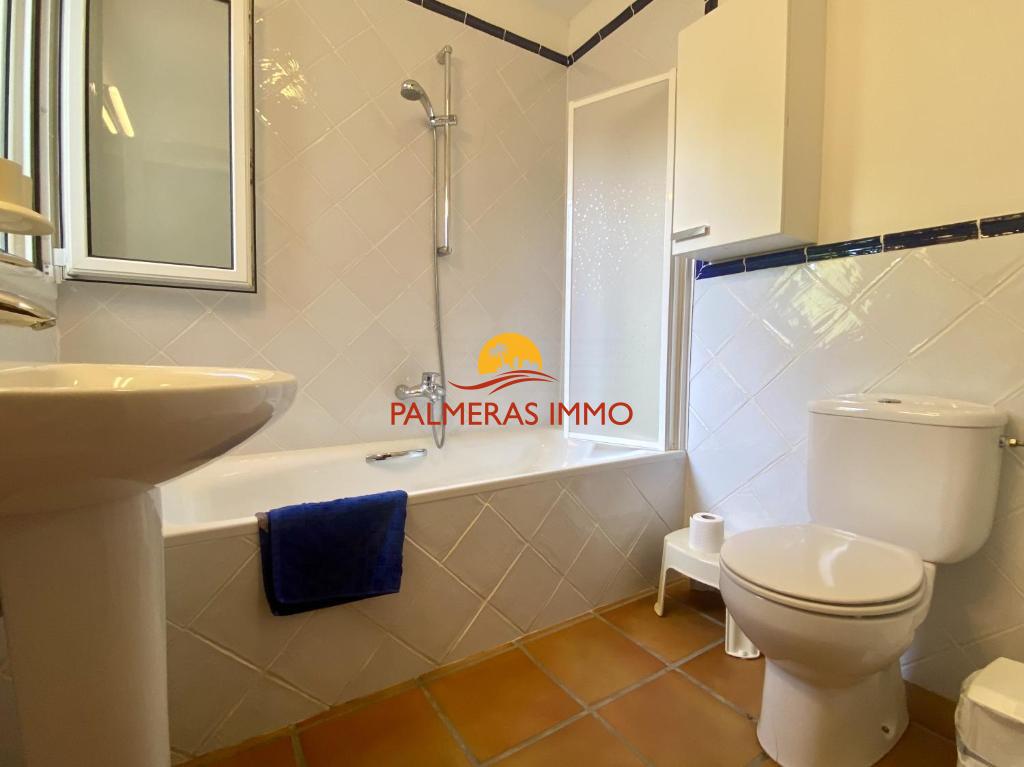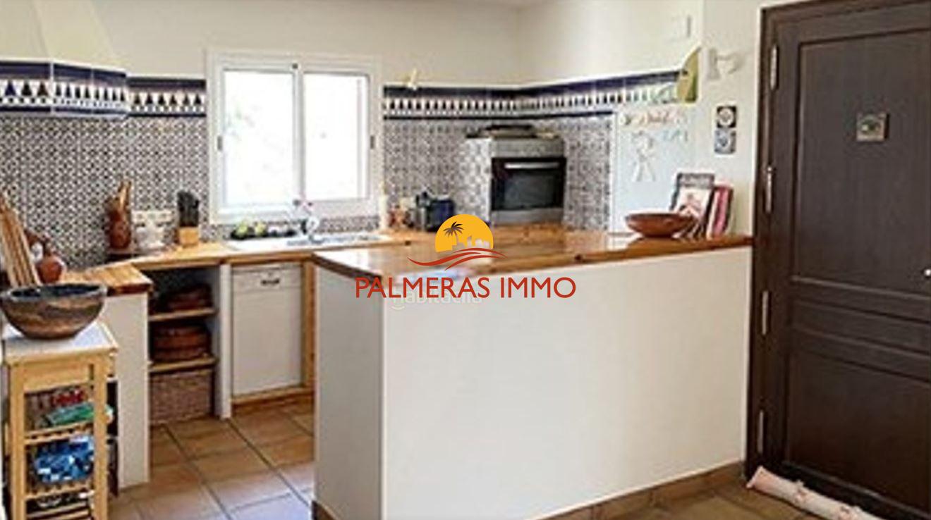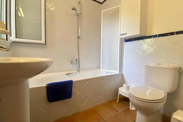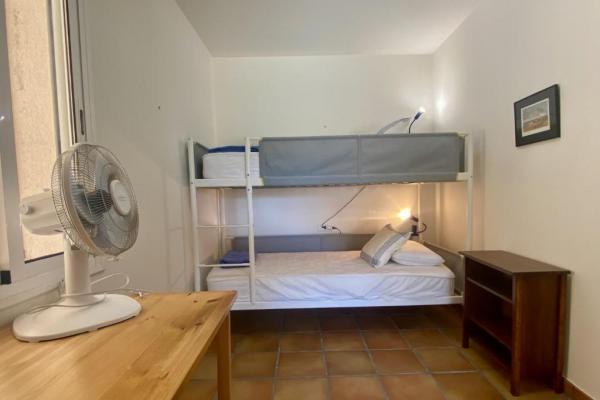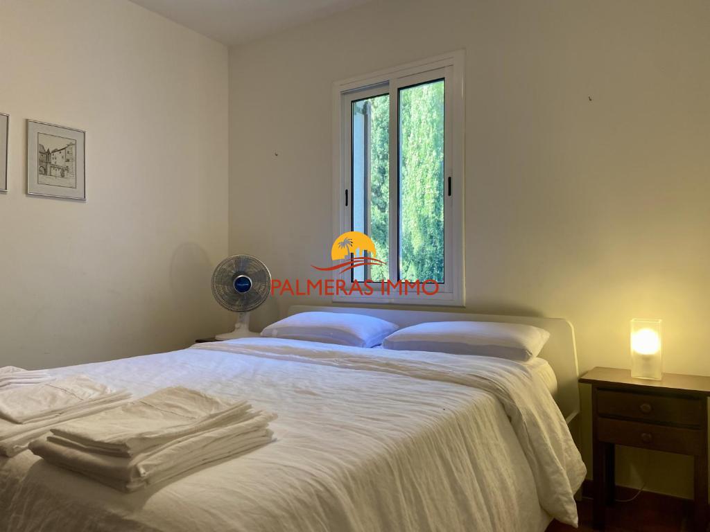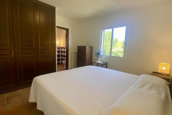 La vivienda ofrece un luminoso salón-comedor con acceso a una amplia terraza con vistas a la piscina, una cocina totalmente equipada y tres dormitorios: uno con cama doble tipo suite, otro con dos camas individuales y un tercero con litera para niños. Dispone además de dos baños completos.