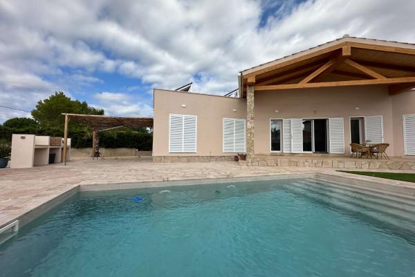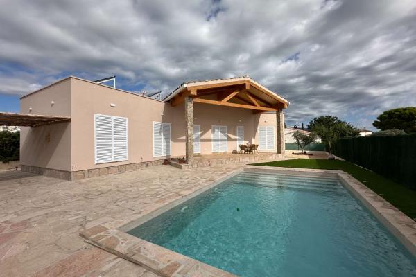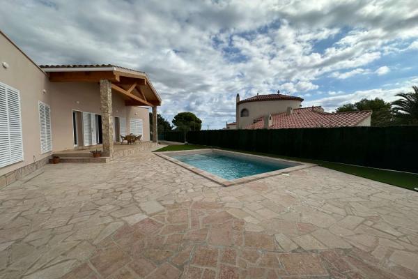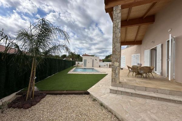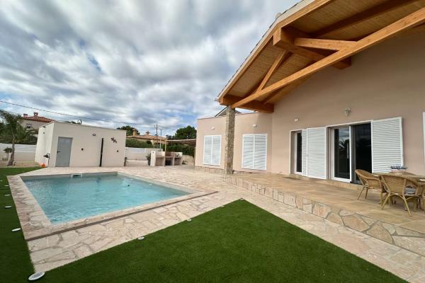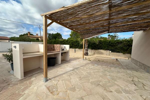 En la parcela de 810 m2 hay una hermosa piscina con sol todo el día, una cocina exterior, un amplio garaje y un aseo independiente.