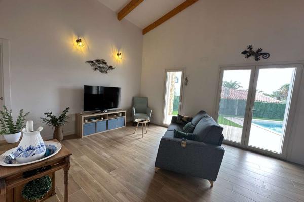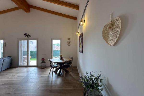 Está compuesto por un gran salón - comedor con salida directa a una gran terraza cubierta y vista a la hermosa piscina. La cocina moderna y bien equipada está abierta para una mayor convivencia. Junto a la cocina se encuentra el lavadero. Hay una toillette independiente para los huéspedes. Un amplio dormitorio tipo suite con toda una pared de armarios y su baño completo. Un segundo baño conduce a otros dos dormitorios grandes.