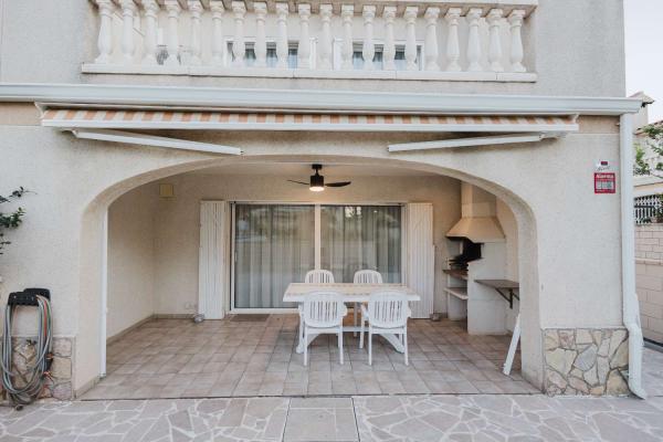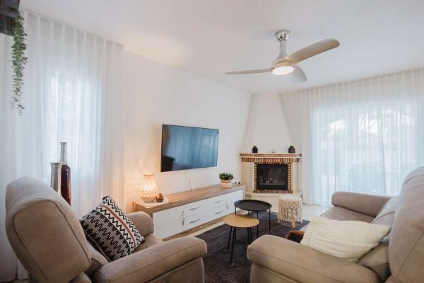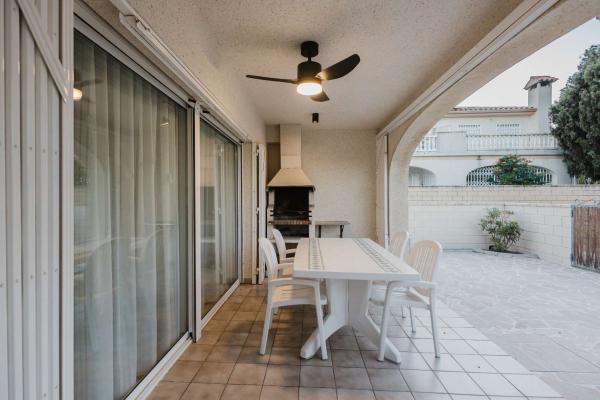 Entrée, salon climatisé, salle à manger avec cheminée et accès direct à une grande terrasse couverte avec espace barbecue, une cuisine indépendante bien équipée et une salle de bain complète